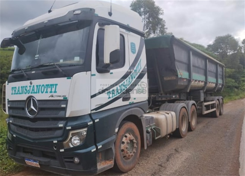 Ao avaliarem a situação, os policiais constataram que se tratava de um conjunto de veículos de carga composto por um caminhão trator e três reboques, carregados com soja.