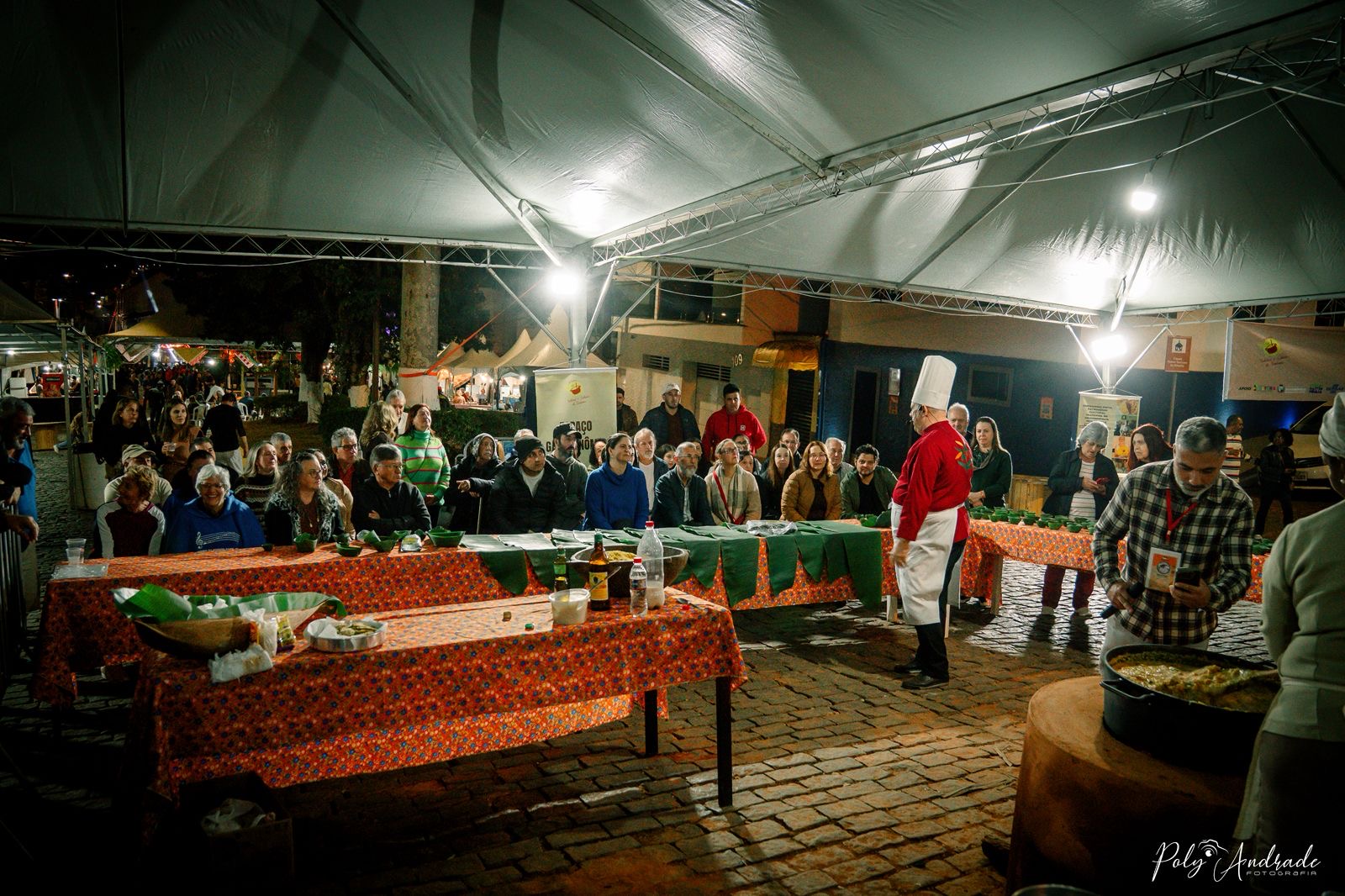 Às 20 horas, mantendo o foco do Festival em divulgar comidas que são patrimônio cultural imaterial do município, do Estado e também da humanidade, o cheff de Gastronomia Raiz, Gilmar Borges, de Pirenópolis – GO, deu início à coordenação das atividades das doçarias do cerrado e mineira ao ministrar a aula-show “Cozinha raiz ancestral do Brasil”, na qual fez uma receita da cozinha típica de Goiás, visitando Minas Gerais com um toque de modernidade.