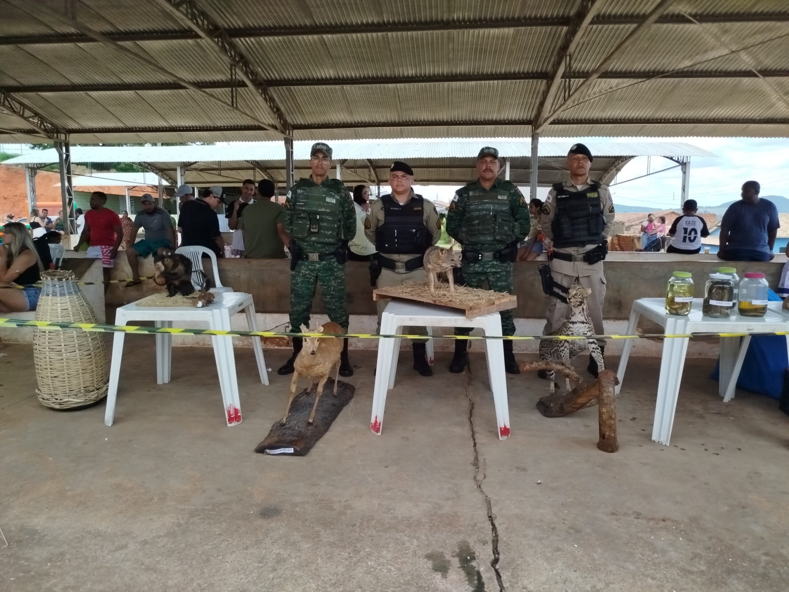 A Polícia Militar de Meio Ambiente montou um estande educativo com exposição de animais, proporcionando às crianças a oportunidade de aprender mais sobre a importância da preservação ambiental.