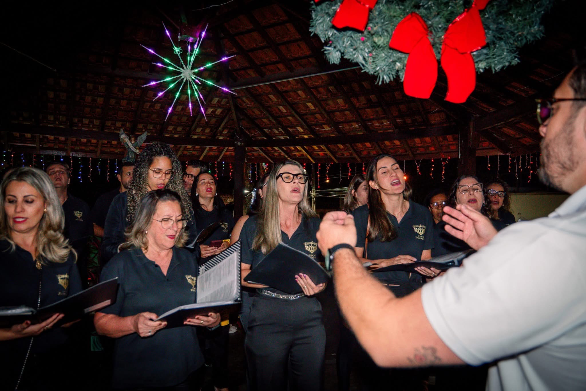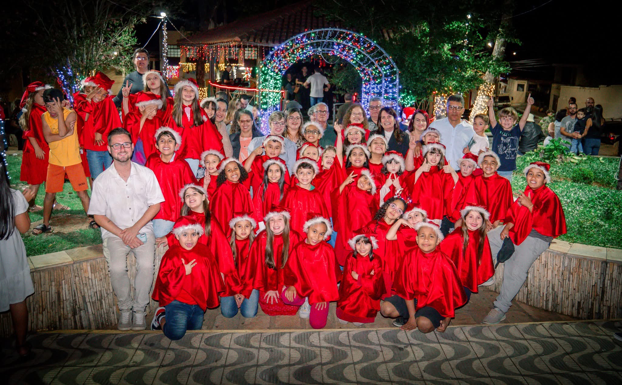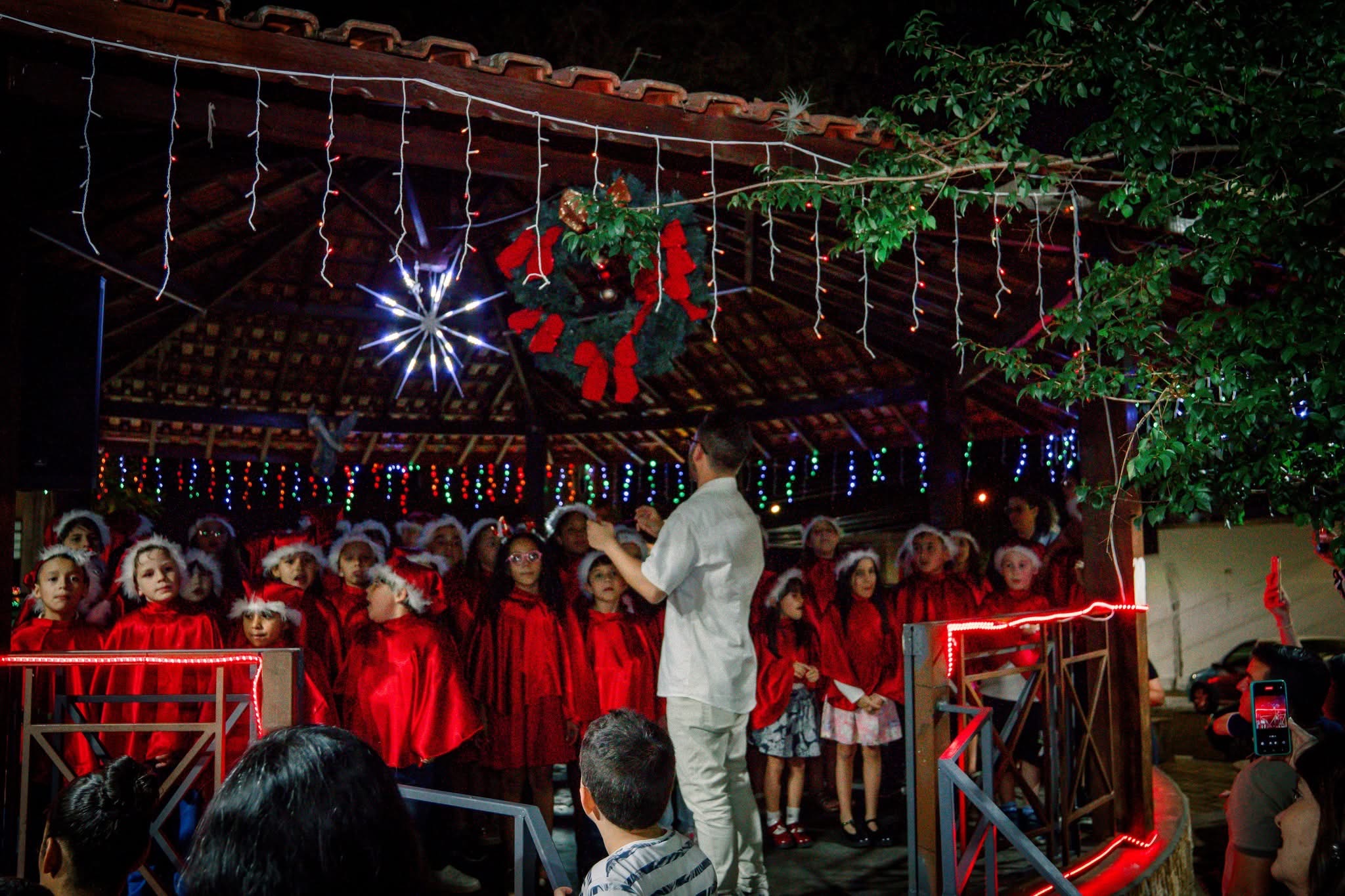 Às 20 horas aconteceu o grande momento da noite: o acender das Luzes de Natal, enchendo a praça de brilho, emoção e esperança. Simultaneamente, o público acompanhou as apresentações do Coral Infantil Vozes de Ouro, de Silvianópolis, e do Coral Paroquial, de Machado.