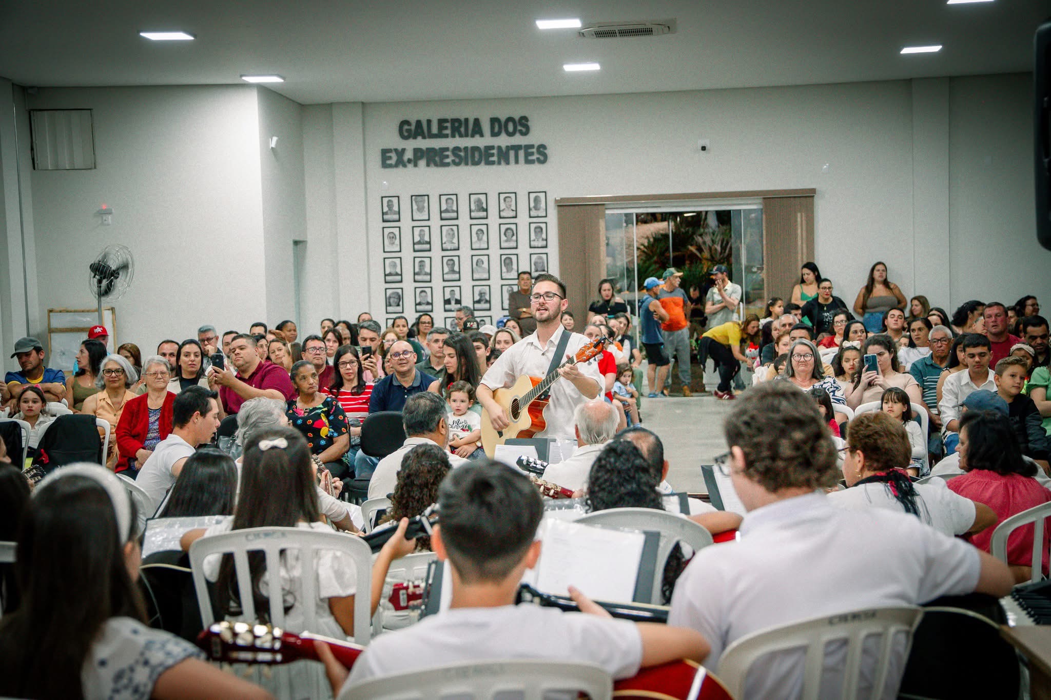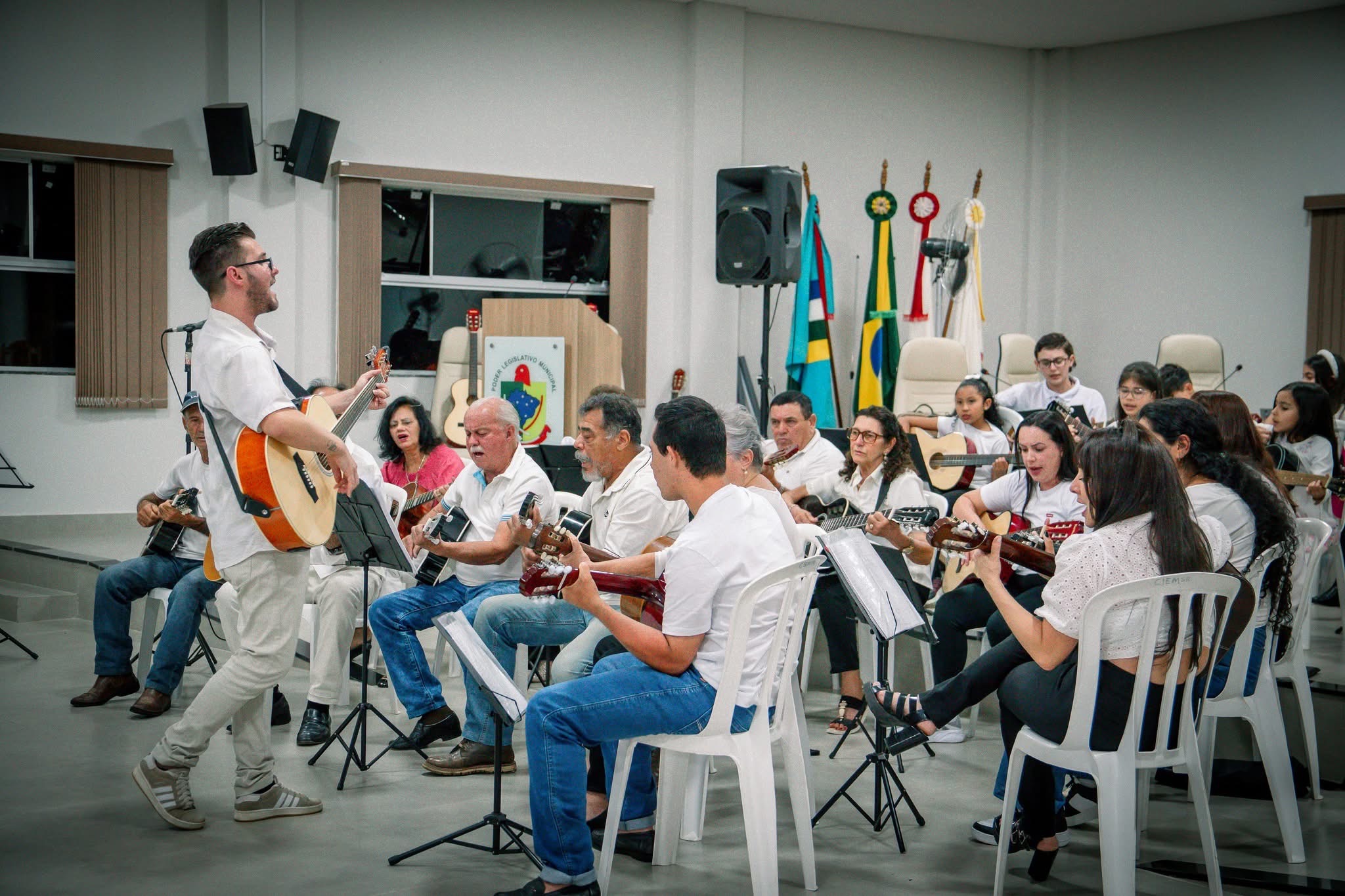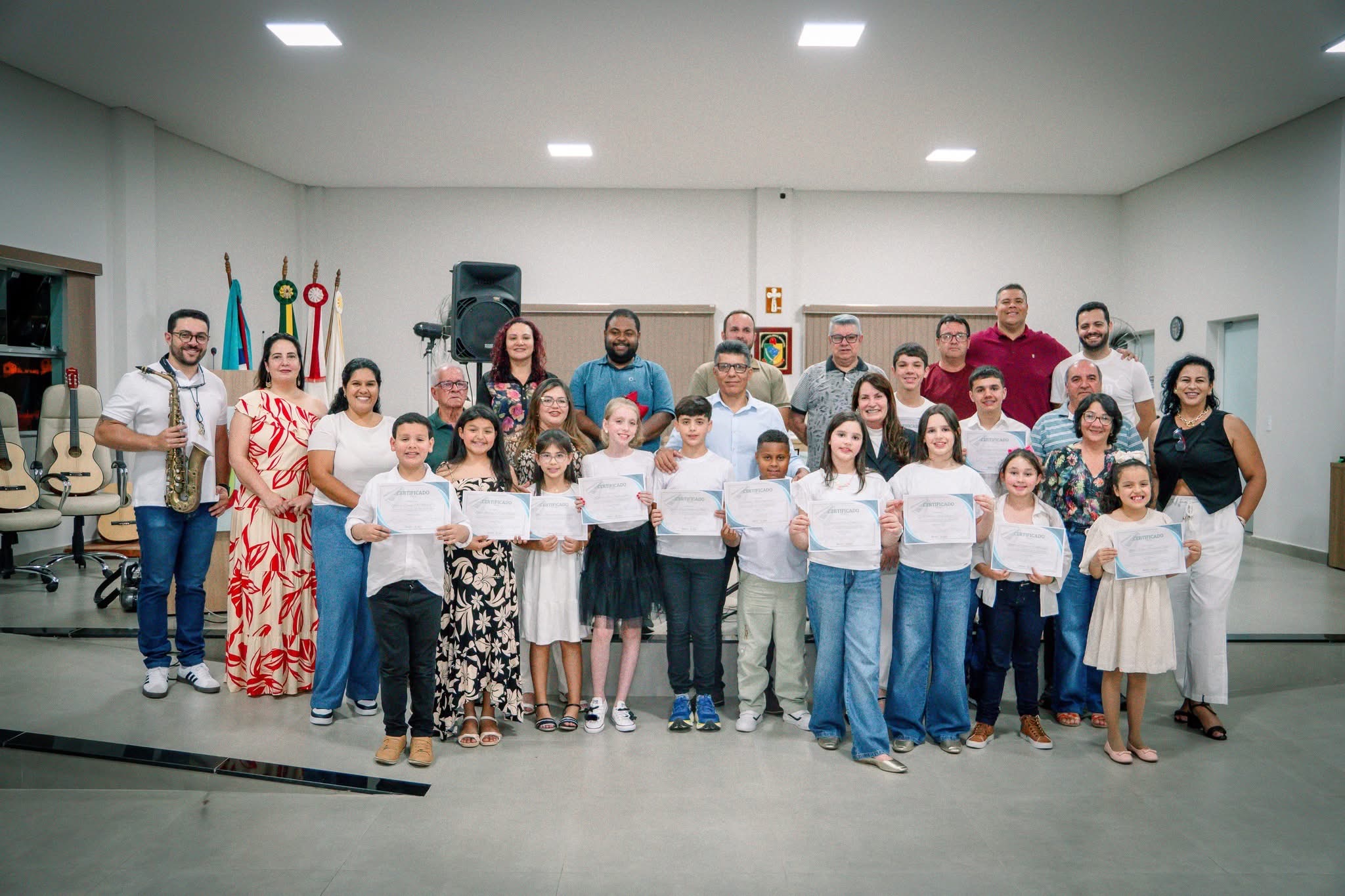 A programação começou na Sala Carlina de Moraes Dutra, na Câmara de Vereadores, com as apresentações das turmas dos projetos de cordas e de teclado da Secretaria de Cultura. Em seguida, o público foi encantado pelo “Saxofoniando”, que seguiu em cortejo até o Coreto da Praça.