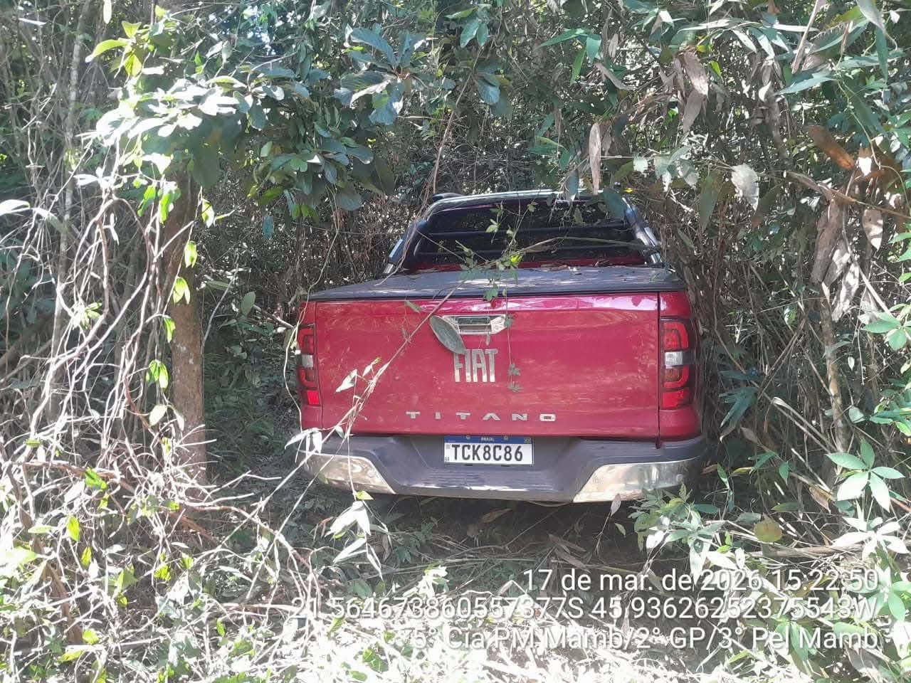No decorrer das diligências, as guarnições foram informadas que uma equipe da Polícia Militar Ambiental de Alfenas havia encontrado a caminhonete Fiat Toro subtraída no roubo, abandonada em uma área de mata próxima a um cafezal.