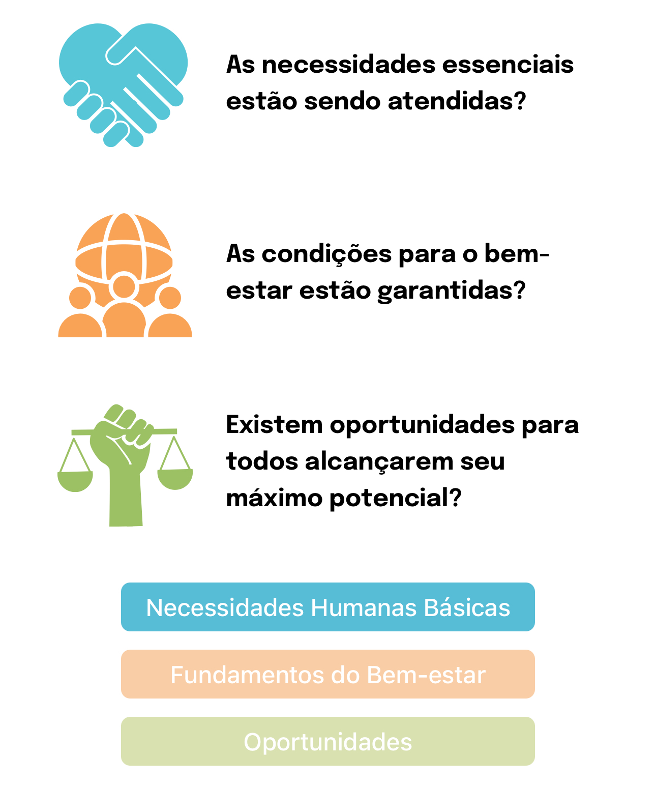 Essa definição é o resultado de uma revisão e síntese aprofundadas de literatura acadêmica e prática que cobre vários tópicos de desenvolvimento. A estrutura do Índice de Progresso Social é centrada em três perguntas distintas, mas inter-relacionadas, que, juntas, oferecem uma visão sobre o nível de progresso social: