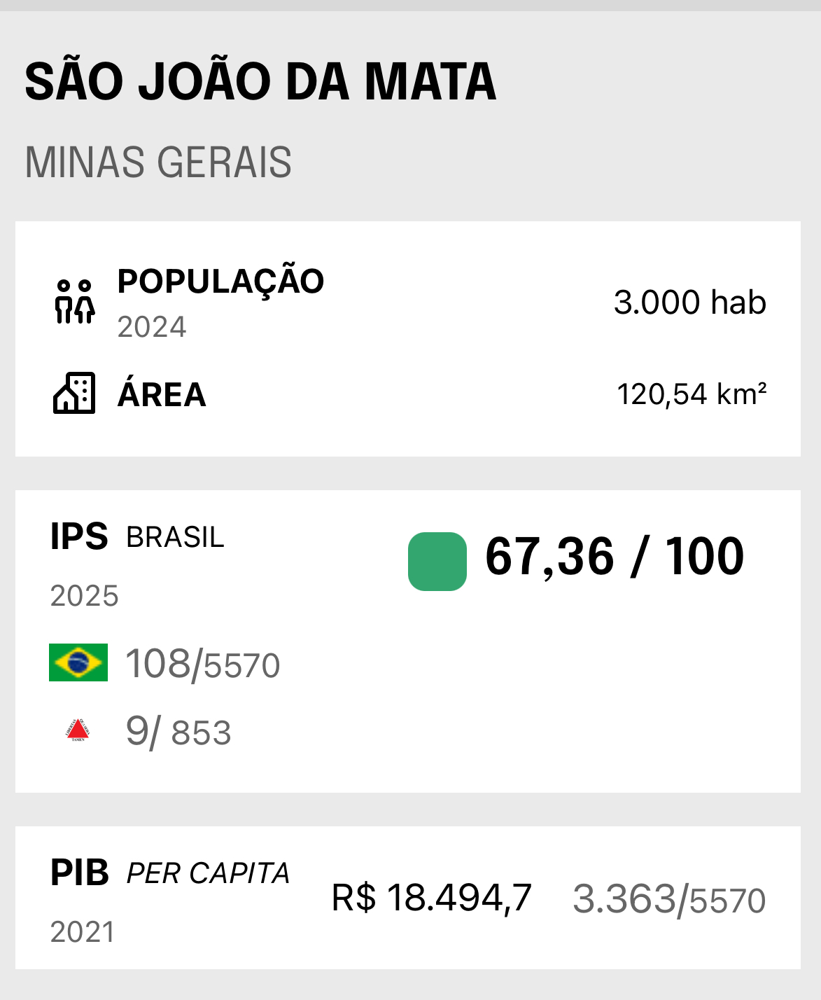 Um dos melhores lugares de Minas Gerais e do Brasil para se viver. Assim foi classificado o Município de São João da Mata, que possui cerca de três mil habitantes, em levantamentos feitos pelo IPS Brasil que ranqueiam as comarcas por estado e a níveis nacionais com melhores índices de qualidade de vida segundo dados apontados através de indicadores sociais e ambientais divididos em três pilares: “necessidades básicas”, “bem-estar” e “oportunidades”. Nas avaliações dos municípios mineiros, São João da Mata apareceu em nono lugar no ranking regional, com nota 67,36.