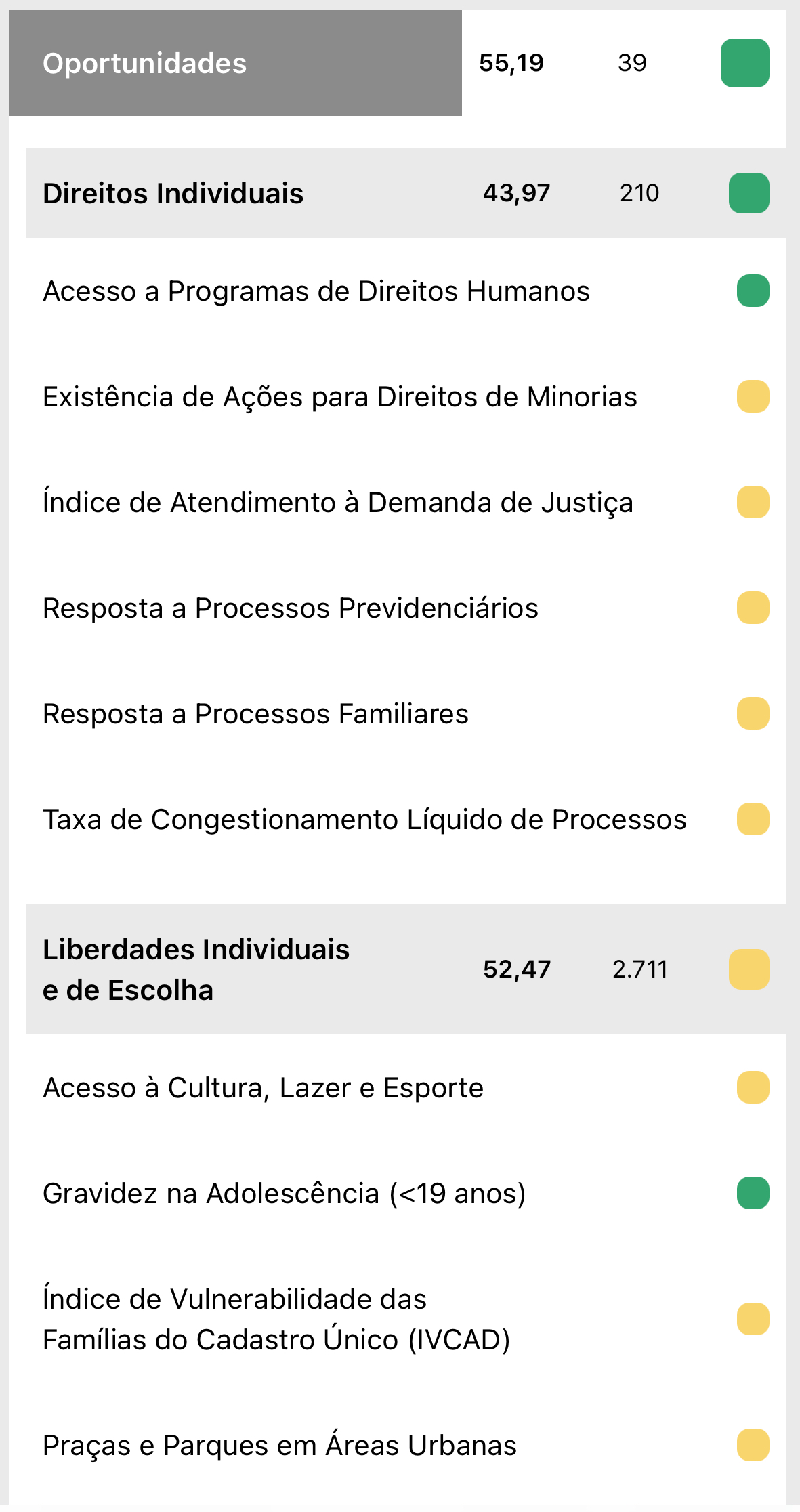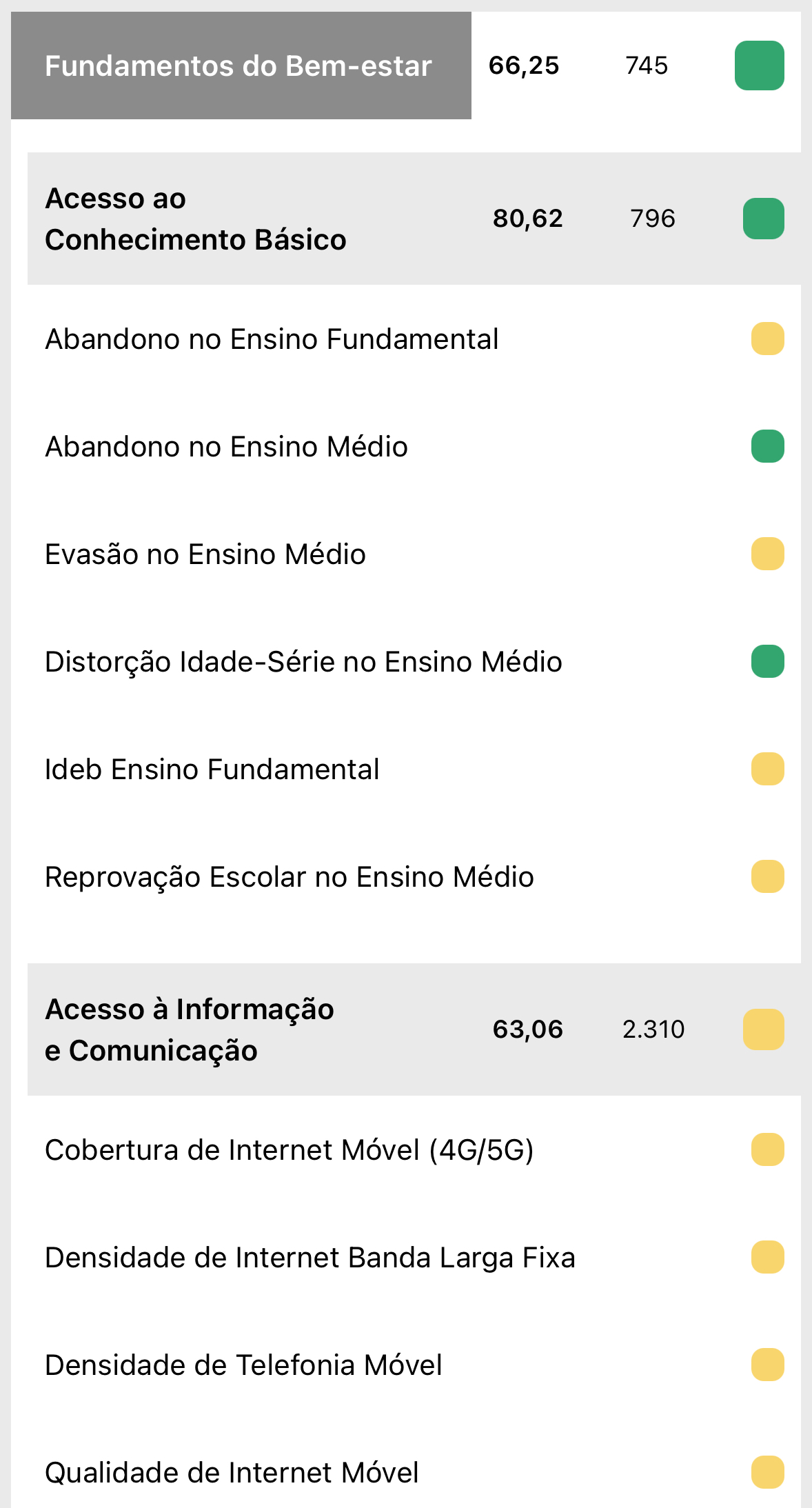 O IPS Brasil é calculado com base em 57 indicadores públicos e atualizados, cobrindo pelo menos 95% dos municípios brasileiros. O índice final varia de O a 100, refletindo o desempenho médio nas três dimensões do progresso social.